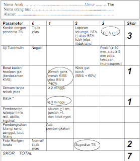 - Anak didiagnosis TB jika jumlah skor > 6, (skor maksimal 13)