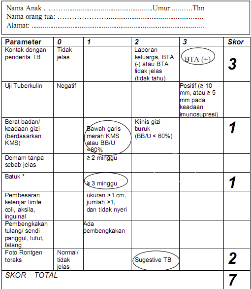 - Anak didiagnosis TB jika jumlah skor > 6, (skor maksimal 13)
