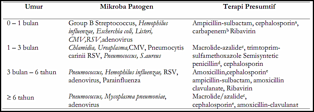 Sedangkan secara mikrobiologi, mikroba patogen penyebab infeksi saluran pernafasan akut serta terapi presumtif pada anak, terinci sebagai berikut: (Dipiro et al, 2005).